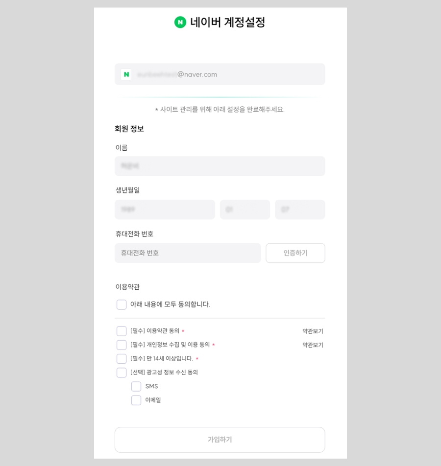 개인 정보 입력 및 약관 동의 후 [가입하기] 버튼을 클릭합니다.